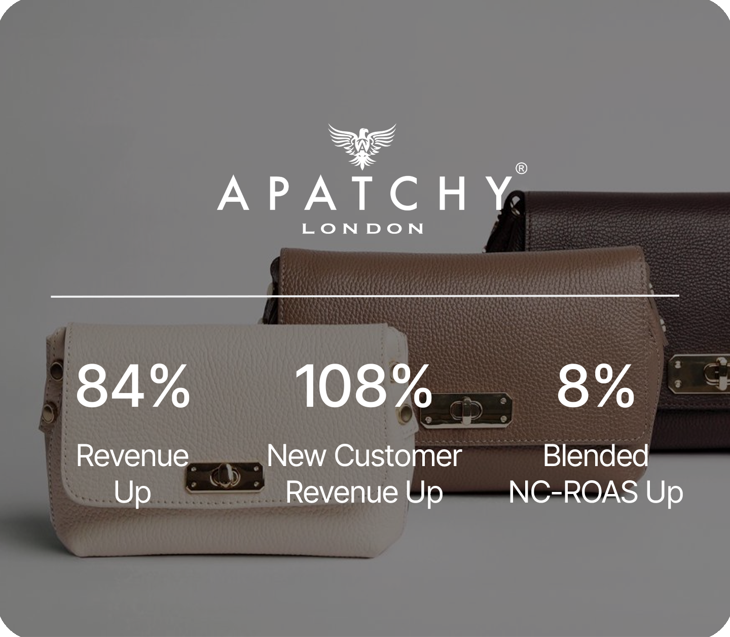We helped Apatchy scale new customer revenue by 108% and total revenue by 84%. By shifting focus to a full-funnel strategy across Meta, Google, Bing, Pinterest and Criteo, we delivered stronger margins and consistent growth with new product launches and clear scaling targets.
